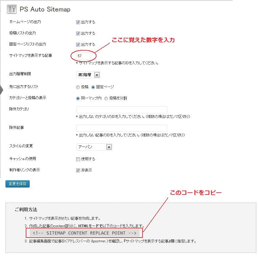次は、設定から「PS Auto Sitemap」を選択して画面上から5行目あたりの「サイトマップを表示する記事」にさっき覚えておいた数字を入力します。