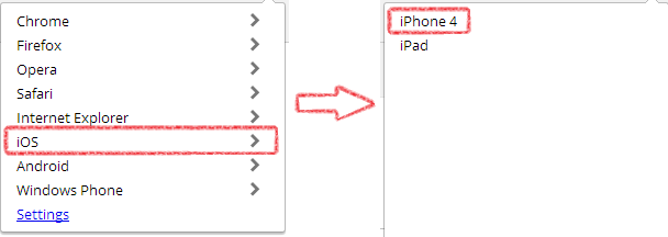 仮面アイコンをクリックしたら、下の画像のようにウィンドウが開きます。iOSをクリックして、iPhone4を選択したら、ブラウザのサイズを調節して完了です。