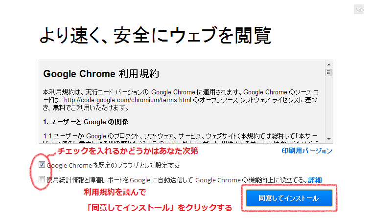 ダウンロードページに移動したら、「Google Chromeを無料ダウンロード」をクリックします。下の画像になるので、Google Chromeを既定のブラウザに設定する場合はチェックをそのままに、したくない場合はチェックをはずします。