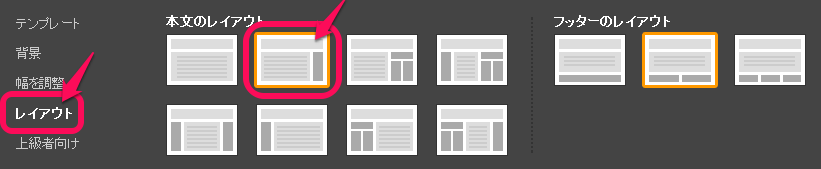 メニューバーの高さを変更するときと同じように、テンプレートのカスタマイズをクリックしたら、レイアウトを選択します。本文のレイアウトで上の左から2番目を選択します。変更できたら右上のブログに適用を押します。
