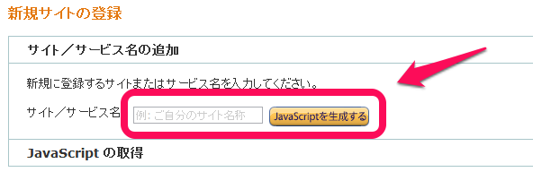 Publisher Studioの管理画面になるので、下のほうにある新規サイトの登録の「サイト/サービス名」に登録するサイト名を入力して「JavaScriptを生成する」ボタンをクリックします。
