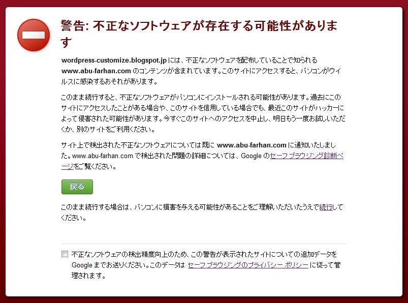 wordpress-customize.blogspot.jp には、不正なソフトウェアを配布していることで知られる www.abu-farhan.com のコンテンツが含まれています。このサイトにアクセスすると、パソコンがウイルスに感染するおそれがあります。今まで問題なく表示されていたのに、なぜこうなったのか。
