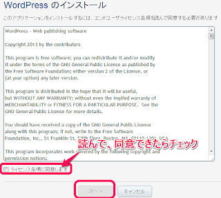 ライセンス条項が表示されるので、同意できたらチェックを入れて「次へ」をクリックします。