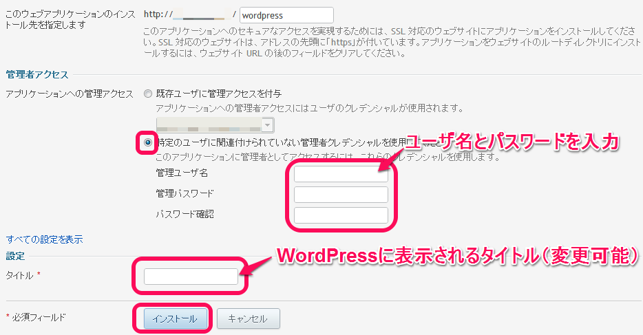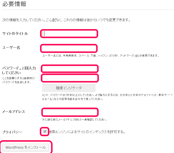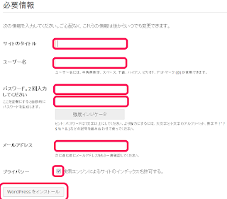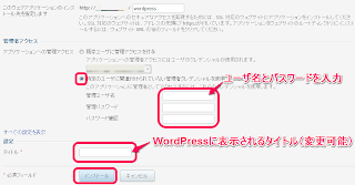 必要情報を入力します。サイトのタイトル、ユーザー名、パスワード、メールアドレスをそれぞれ入力します。