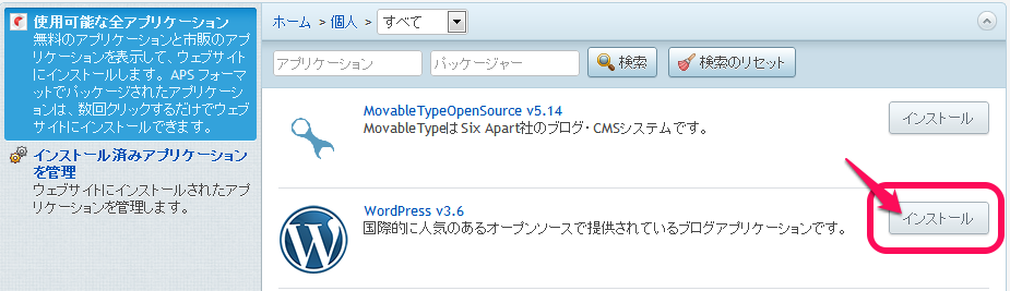アプリケーションがいくつか表示されるので、そのなかからWordPressのインストールをクリックします。