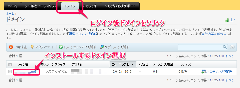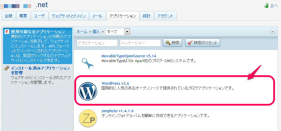 ログイン後、ドメインをクリックして、WordPressをインストールするドメインを選択します。次に、アプリケーションをクリックして、個人を選択します。