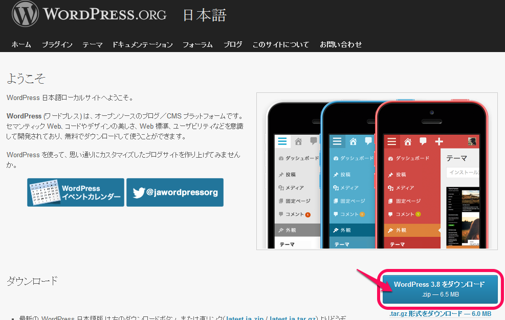 http://ja.wordpress.org/からWordPressをダウンロードします。右の「WordPress○○をダウンロード」をクリックします。