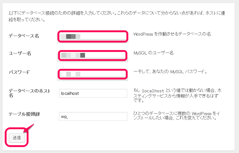 データベースのホスト名とテーブル接頭辞はそのままで大丈夫です。
