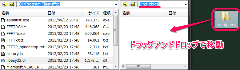 次に、デスクトップに解凍したwordpressを、httpdocs内にドラッグアンドドロップでアップロードします。