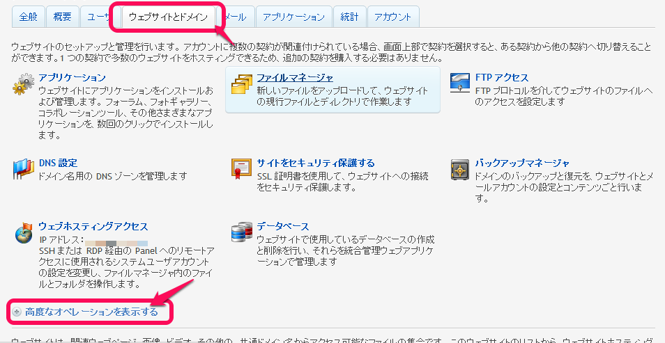 ホームの自分の契約に表示されているドメインをクリックします。ウェブサイトとドメインをクリックして、高度なオペレーションを表示するをクリックします。