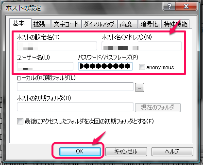 ユーザー名とパスワードは上のホスティングの設定で入力したユーザー名とパスワードを入力します。