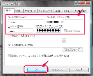 使用しているFTPソフトはFFFTPです。FFFTPを起動し、ホストの設定名、ホスト名、ユーザー名、パスワードを入力します。