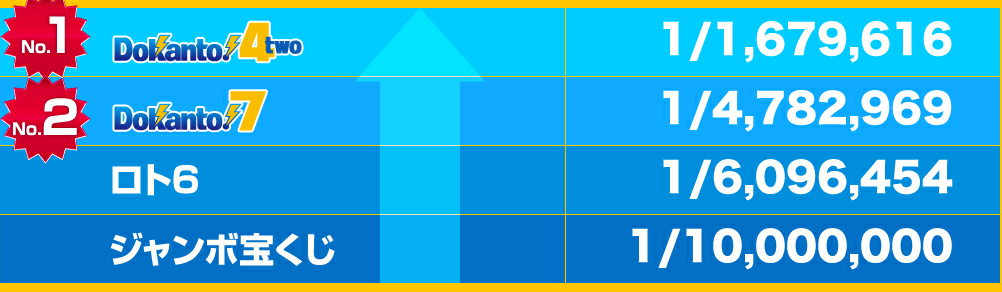 ドカント4twoとドカント7は、宝くじやロト6などのクジの中で、一等の的中率がトップクラスです。確率は、ドカント4twoで1,679,616分の1、ドカント7が4,782,969分の1です。