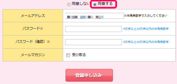 利用規約を読んで同意できたら、「同意する」にチェックを入れます。メールアドレスをパスワードを入力して、メールマガジンを受け取るかどうかを選択します。最後に「登録申し込み」ボタンをクリックします。