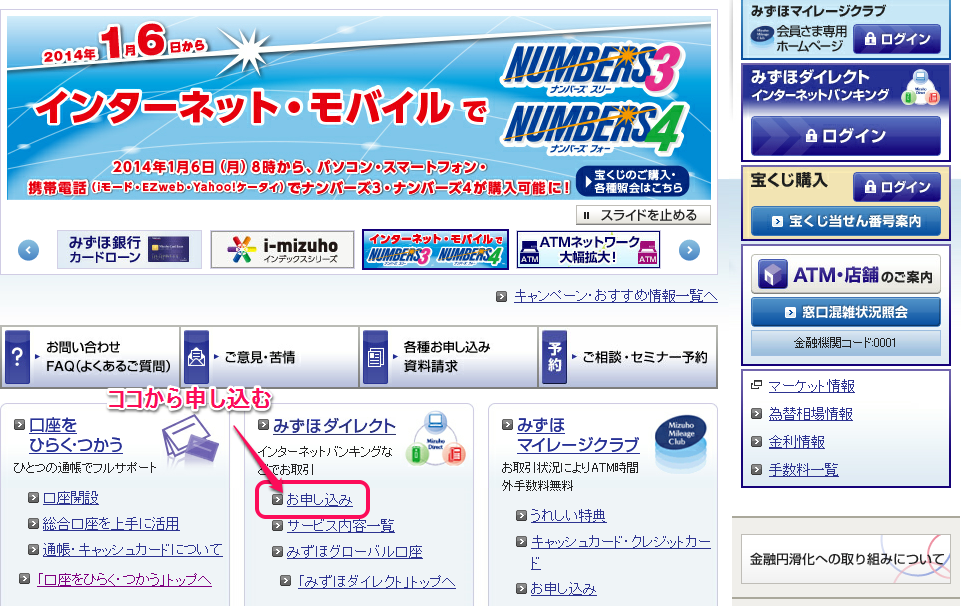 トップページで少しスクロールすると「お申し込み」が出てきます。ちなみに私は、上記三行全ての口座を持っています。使用頻度は「ジャパンネット銀行」>「楽天銀行」>「みずほ銀行」の順で利用しています。