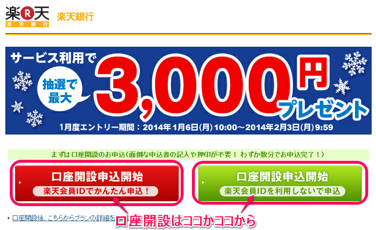 2014年2月3日9:59まで、サービス利用で最大3000円が抽選であたります。みずほ銀行の口座開設