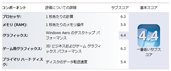 評価はグラフィックスが4.4で、ゲーム用グラフィックスが6.3にアップしました。参考:Windows エクスペリエンス インデックスとは