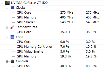 グラボの温度は35℃、ファンは40%でした。その他の数値は画像で確認してください。