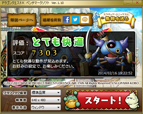 オンボードではテストさえできなかった、ドラクエ10のベンチマークテストをしてみました。グラフィック設定を標準品質、解像度を640×480、表示方法をウィンドウでテストした結果です。
