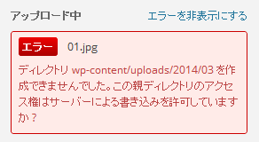 WordPressでメディアアップロードをするときに、「ディレクトリ wp-content/uploads/2014/03を作成できませんでした。この親ディレクトリのアクセス権はサーバーによる書き込みを許可していますか?」と表示され、画像が追加できないときの対処法です。