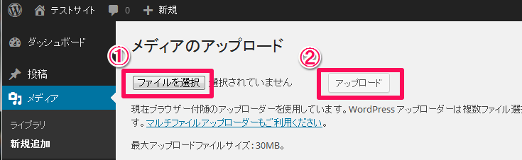 メディアの新規追加で、ブラウザアップローダーをクリックします。