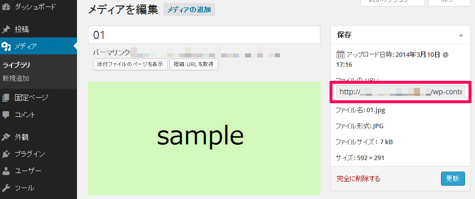 メディアのライブラリで、アップロードした画像の「編集」をクリックします。