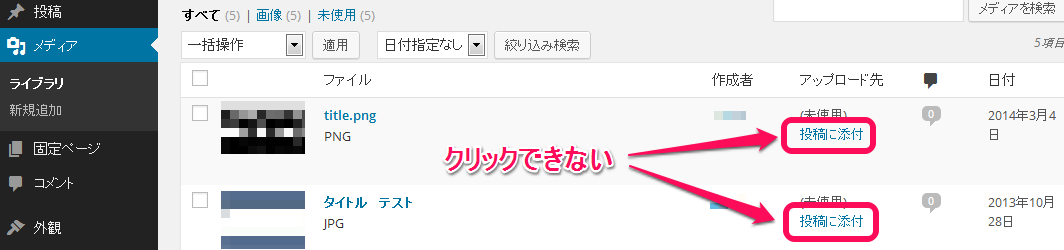 メディアライブラリに追加されている画像を「投稿に添付」できない。