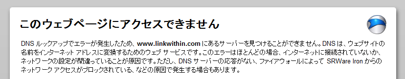 Linkwithinのサイトにアクセスしてみると、エラーで「このウェブページにアクセスできません」となります。このときは一時的なもので、数日後に何事もなく復活していました。
