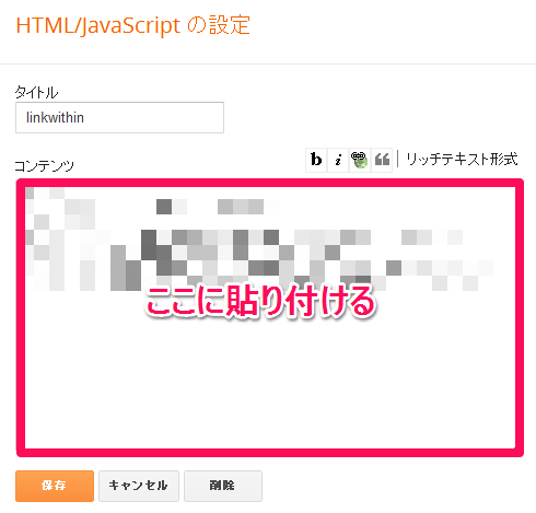 今回は、上の画像のようにタイトルに「linkwithin」と入力したので、HTMLの編集で「linkwithin」を検索します。