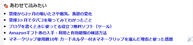 下の画像が変更前の表示です。タイトル(あわせて読みたい)は別として、Bloggerを使っている方の一般的な関連記事の表示になっていると思います。禁煙に関する記事の関連記事です。