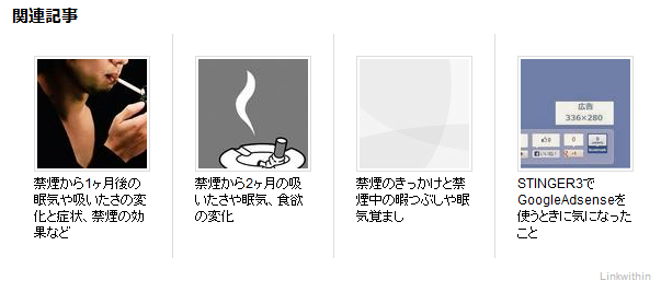 下の画像が変更後の表示です。記事タイトルと共に画像を表示するようしました。変更前と同じ禁煙に関する記事の関連記事です。