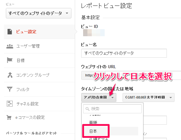 レポートビュー設定のタイムゾーンの国または地域で「日本」を選択します。
