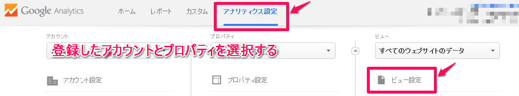 まず、アナリティクス設定で登録したサイトを選択し、ビュー設定をクリックします。