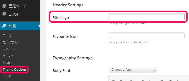ファビコンは、プラグインを使用して変更しているため、Favourite Iconは使用していませんが、Site Logo同様ファイルのURLを貼り付けるだけで変更できそうです。
