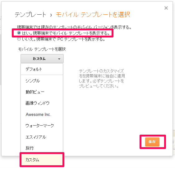 テンプレートのモバイル画像の下にある歯車ボタンをクリックし、