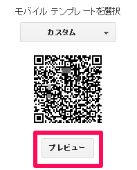 テンプレートのモバイル画像の下にある歯車ボタンをクリックします。QRコードの下のプレビューボタンを押すと、スマホサイズのウィンドウが開き確認できます。
