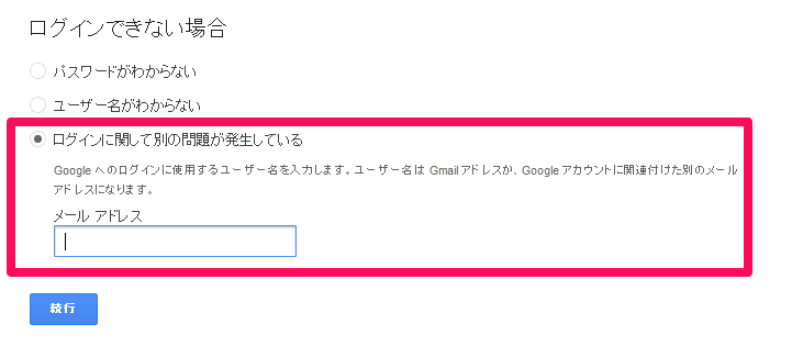 今回は、「ログインに関して別の問題が発生している」を選択しました。