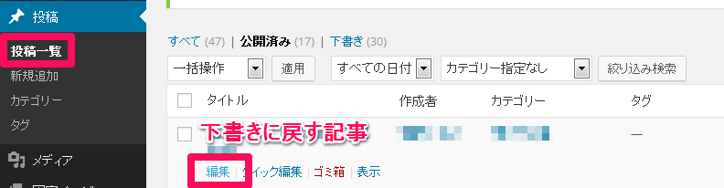 これで重複ペナルティを避けられるかは別として、WordPressで作成した記事に限らず、301リダイレクトするほどではないけど、他のサイトに記事を移動したいときなど、一度公開した記事を下書きに戻すことがあります。