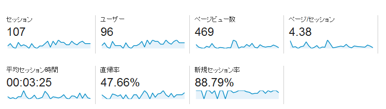 下の画像は、Googleアナリティクスのユーザーサマリーで、ツイッター連携前の1ヶ月の数値です。ページ/セッションが3.79、平均セッション時間は3:22、直帰率は45.07%と満足のいく数値ですが、ユーザー数が1日に平均で約2人と非常に少ない状態です。(自分のアクセスは除外しています。)