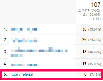 全体のセッションが107あり、その内の8がツイッターからのアクセスでした。これは全体の7.48%にあたります。ツイッター登録から40日
