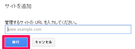 ウェブマスターツールにログイン後、サイトを追加します。管理するサイトのURLを入力して、続行をクリックします。