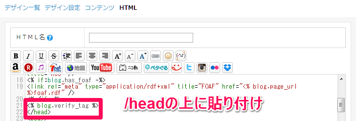 タイトルを入力後、21行目の/head上に<% blog.verify_tag %>を追加し保存をします。