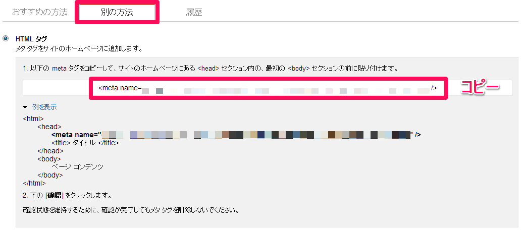 metaタグをコピーして例のようにhead下に貼り付けます。