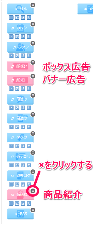 デザイン>PC>コンテンツのサイドバーエリアにある「ボックス広告」「バナー広告」「商品紹介」の3つを削除します。コンテンツの右上にある×をクリックするとゴミ箱に移動して削除することができます。完全に削除する場合は、ゴミ箱を空にするをクリックします。