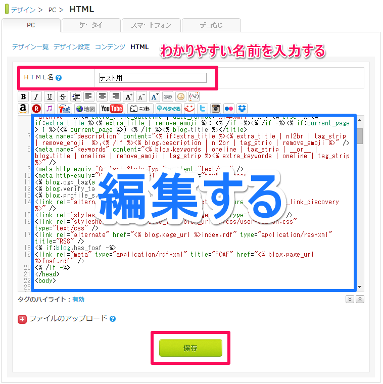 HTML名にわかりやすい名前を入力し、HTMLを編集して保存をします。