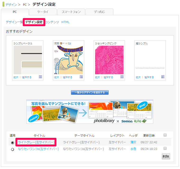 デザイン>PC>デザイン設定から、編集するテンプレートのタイトルをクリックします。
