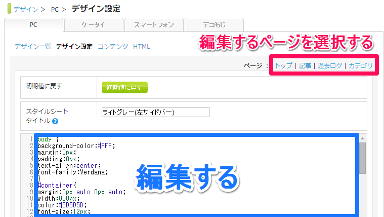 編集ページになるので、トップ・記事・過去ログ・カテゴリの中から編集したいページを選択します。