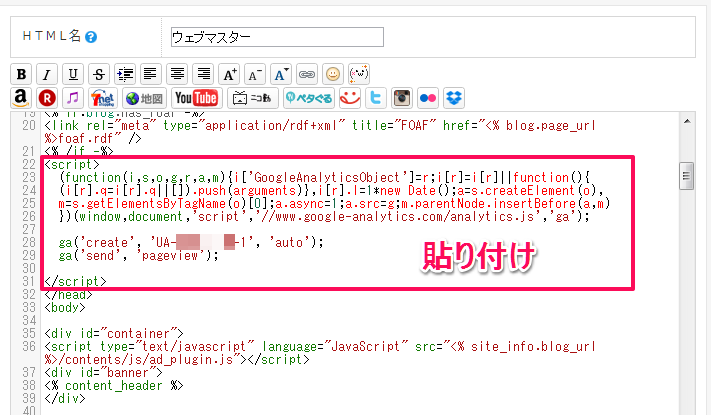 今回は、ウェブマスターツールに登録したときのHTMLに追加しました。ここで名前もウェブマスター・アナリティクスに変更しました。