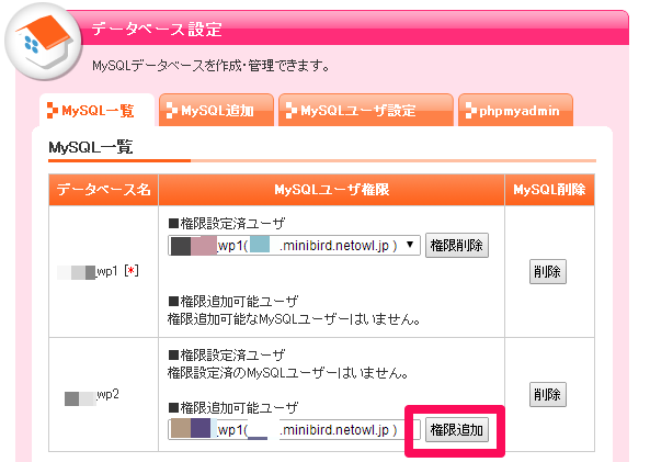 「権限追加」をクリックして、データベースを作成します。「権限削除」に変わればOKです。
