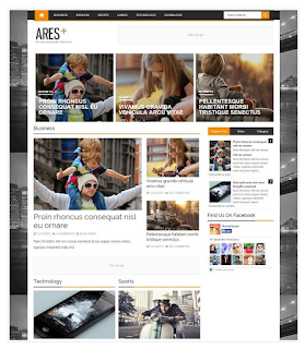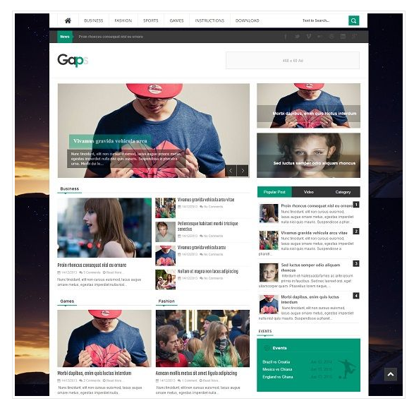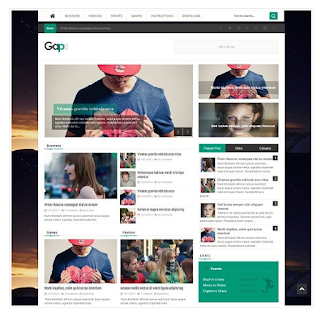 トップページ上部の大きなスライダー(スライドショー)が目を引くテンプレート。最上部にはニュース速報が流れる。記事下とサイドバーにSNSボタンを完備。